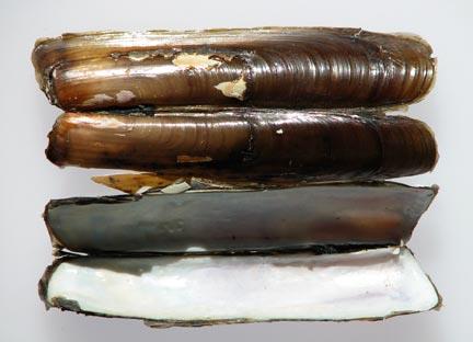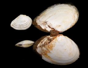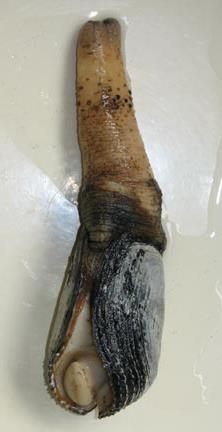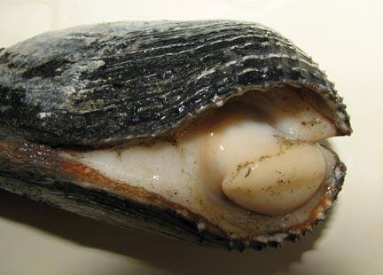 The Pacific Gaper Clam (Tresus nuttallii) is the largest and deepest burrowing clam in the bay. Also called the horse clam, it can reach eight inches long and burrow down to three or more feet. Its shell, when not stained, is creamy white and partly covered with a brown varnish-like chitinoid coating called a periostracum. The two shells gape on the posterior end where the neck protrudes, hence its common name. The clam can also be identified by the internal hinge ligament that fits into a pair of spoon-shaped depressions in the shells called chondrophores. The large neck, the meatiest part of the clam, has fused incurrent and excurent siphons and is sheathed with part of the periostracum. The tip of the neck bears two hard, leathery plates. These gaper clams are found in various parts of the bay, usually clustered in sandy sediments. The neck hole is an inch or more across, and if you stick in your finger, you can feel the hard plates just before the siphons is retracted. You may also get hit with a jet of water that is expelled when the clam is disturbed. When digging for the clam, be careful not to break the fragile shells. The neck, after tenderizing, is good fried or in chowder, but should be dipped in boiling water first to aid in removing the periostracum. The leathery plates can be clipped off. When cleaning the clam, you will likely find one of three species of commensal (or parasitic) pea crabs, Pinnixa faba, Pinnixa littoralis, or Fabia subquadrata in the mantle cavity. They also inhabit other clams.