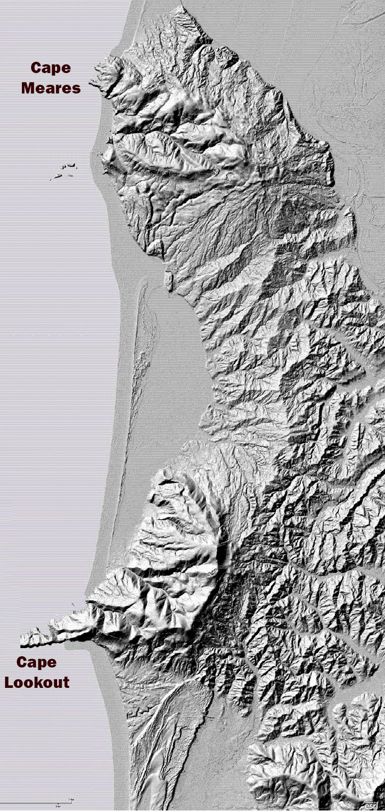 The Grande Ronde basalt flows covered more than 55,000 square miles and filled the area with 36 cubic miles of basalt, in some places nearly a mile deep.  Most of the activity occurred over a period of less than one million years.  These flows now form ocean headlands at Seal Rock, Otter Rock, Depoe Bay, Yaquina Head, Cape Lookout, Cape Mears, Cape Falcon and Tillamook Head.  The more erosion resistant basalt also caps Coast Range peaks such as Mt. Hebo and Saddle Mountain.  Numerous theories are being debated among geologists as to what caused these massive flows to occur.