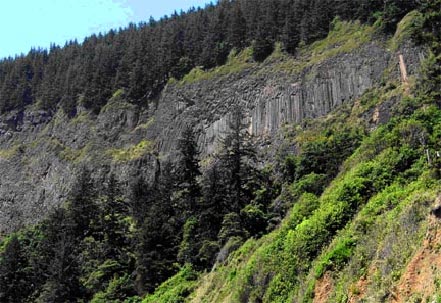 For several years geologists debated the origin of these rocks. They now know that these extrusive volcanic rocks originated in eastern Oregon and flowed westward toward the Oregon Coast. The Cape Mears and Cape Lookout headlands are considerably younger than other volcanic rocks found in the Coast Range.  They are between 6 and 15 million years old and flowed from long narrow cracks in the earths crust in the area near the Washington, Idaho and Oregon borders.  Lava began to flow in unbelievable proportions from these crevices. It quickly started to fill valleys and kept on flowing.  It covered hills and kept on flowing.  It covered mountains and continued to flow. It flowed down the Columbia River valley and flowed all of the way to the Pacific Ocean.