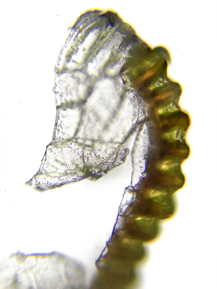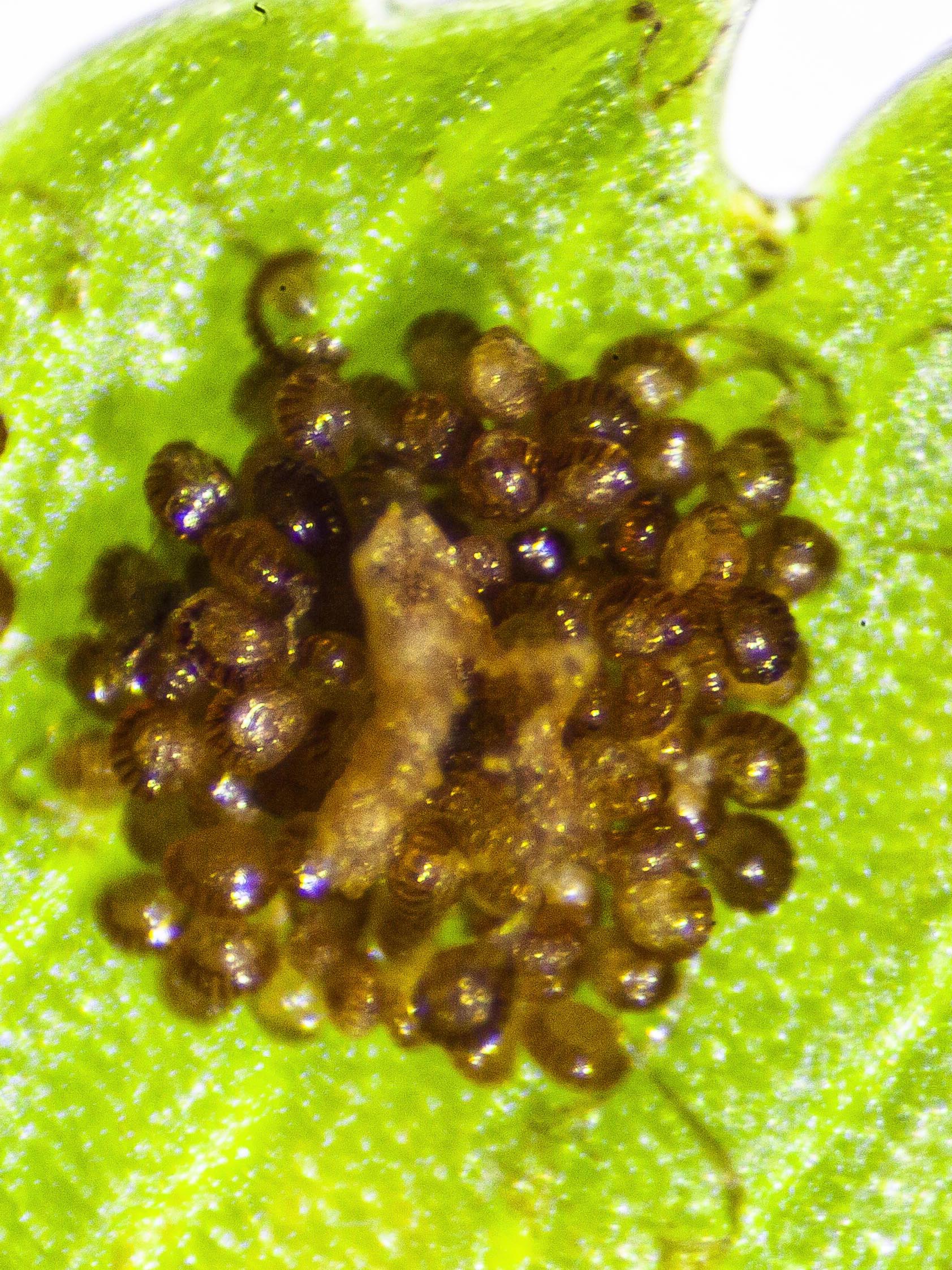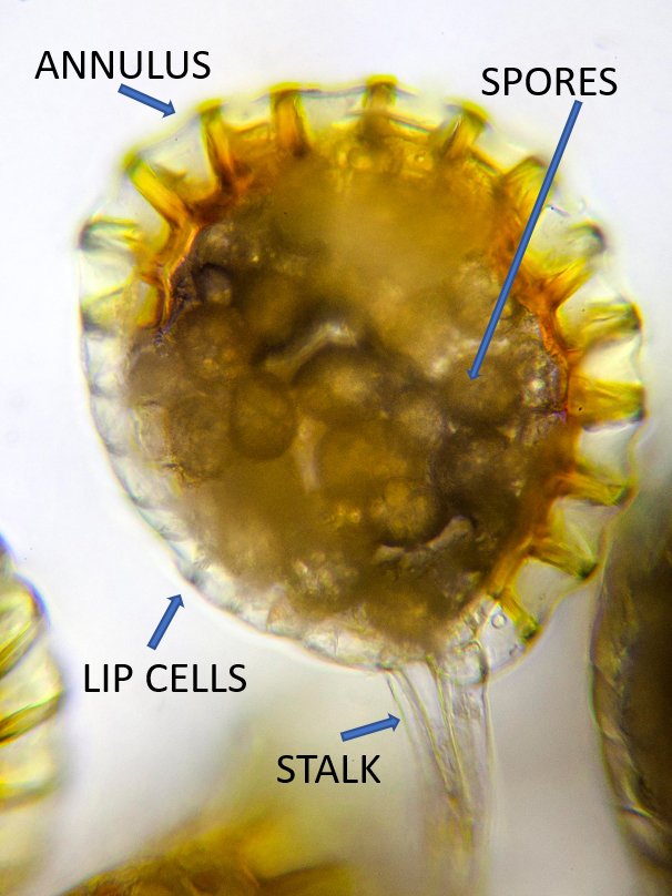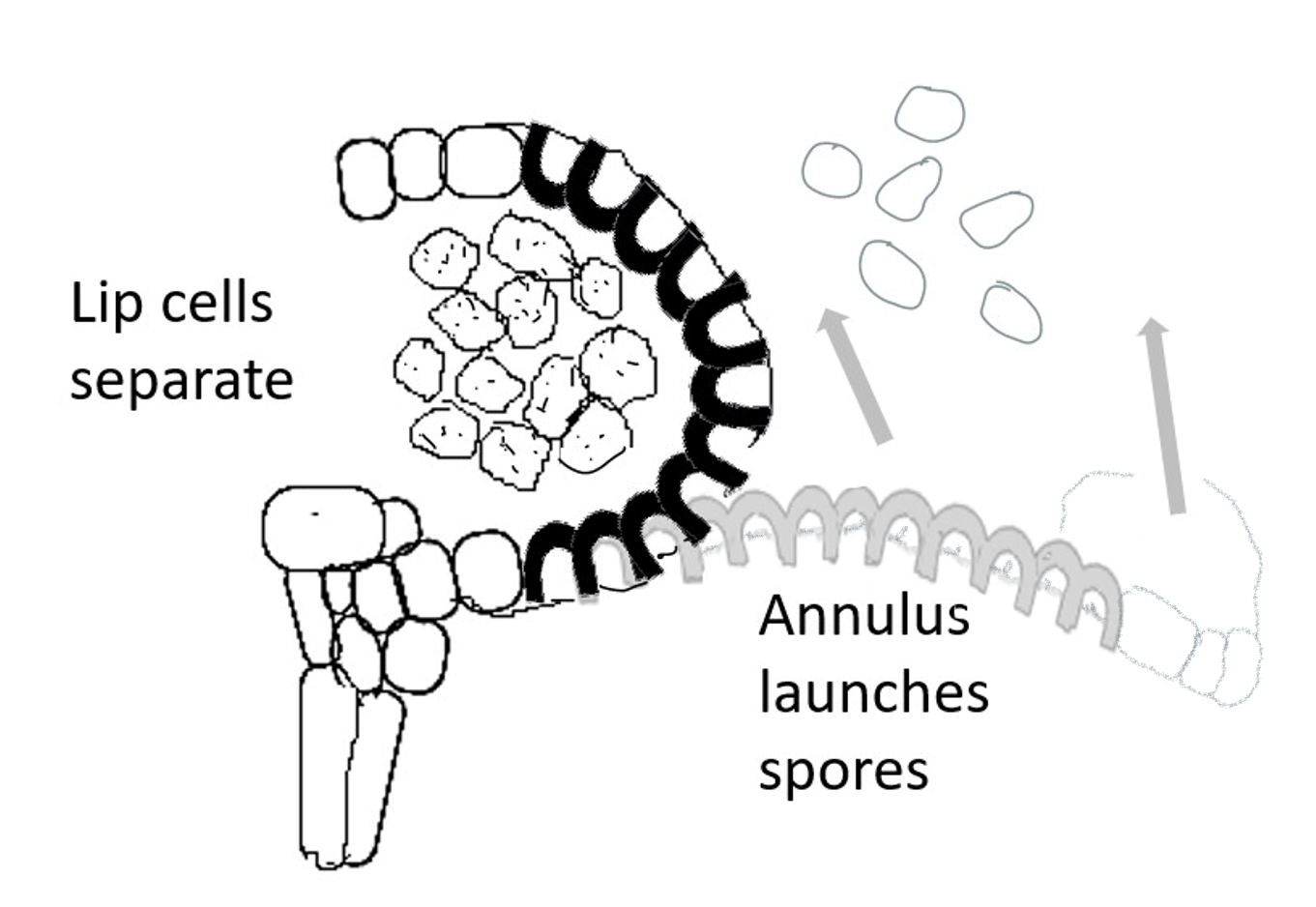 The mechanism for the dicharge and dissemination of spores by a mature sporangium is remarkable. The spoangium consist of a hollow, rather spherical case of flattened cells enclosing the spores, commonly around 64. It is connected to the base of the sorus by a thin stalk. Arching over about two-thirds of the spoangium is a narrow row of thick-walled cells termed the annulus. Continuing along the other third of that same row to the stalk are thinner walled cells, two of which are called lip cells. The cells of the annulus can fill with water during the wet season. When the water begins to evaporate during the dry season, cohesive and even stronger adhesive forces of the water come into play. As evaporation proceeds, water inside each annulus cell adheres to its thick latteral walls, and cohesion of the water molecules resists the water from breaking apart. This results in the latteral walls pulling together, straightening the annulus and opening the sporangium by separating the lip cells. As the spoangium opens, it caries the spores along. A point is finally reached at which the tensile strength of the water inside each cell caused by the straightening of the annulus is greater than the water’s cohesive forces. The water breakes, filling the cells with water vapor. This releases the tension on the elastic radial walls of each cell causing the annulus to spring back, catapulting the spores outward an inch or two.