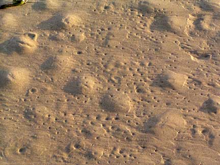 Beach Sands - Sand Bubbles and Sand Mounds When you walk along the sandy beach and watch the waves flow onto dry sand during an incoming tide, you may notice hundreds of small mounds and round holes that form as the wave recedes. Click here for more information!