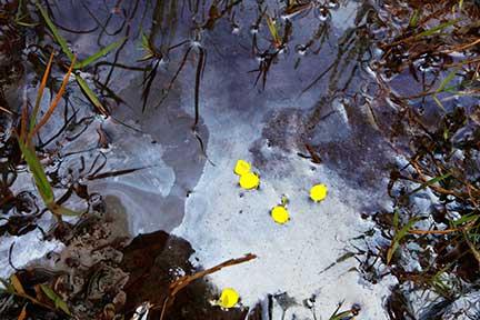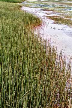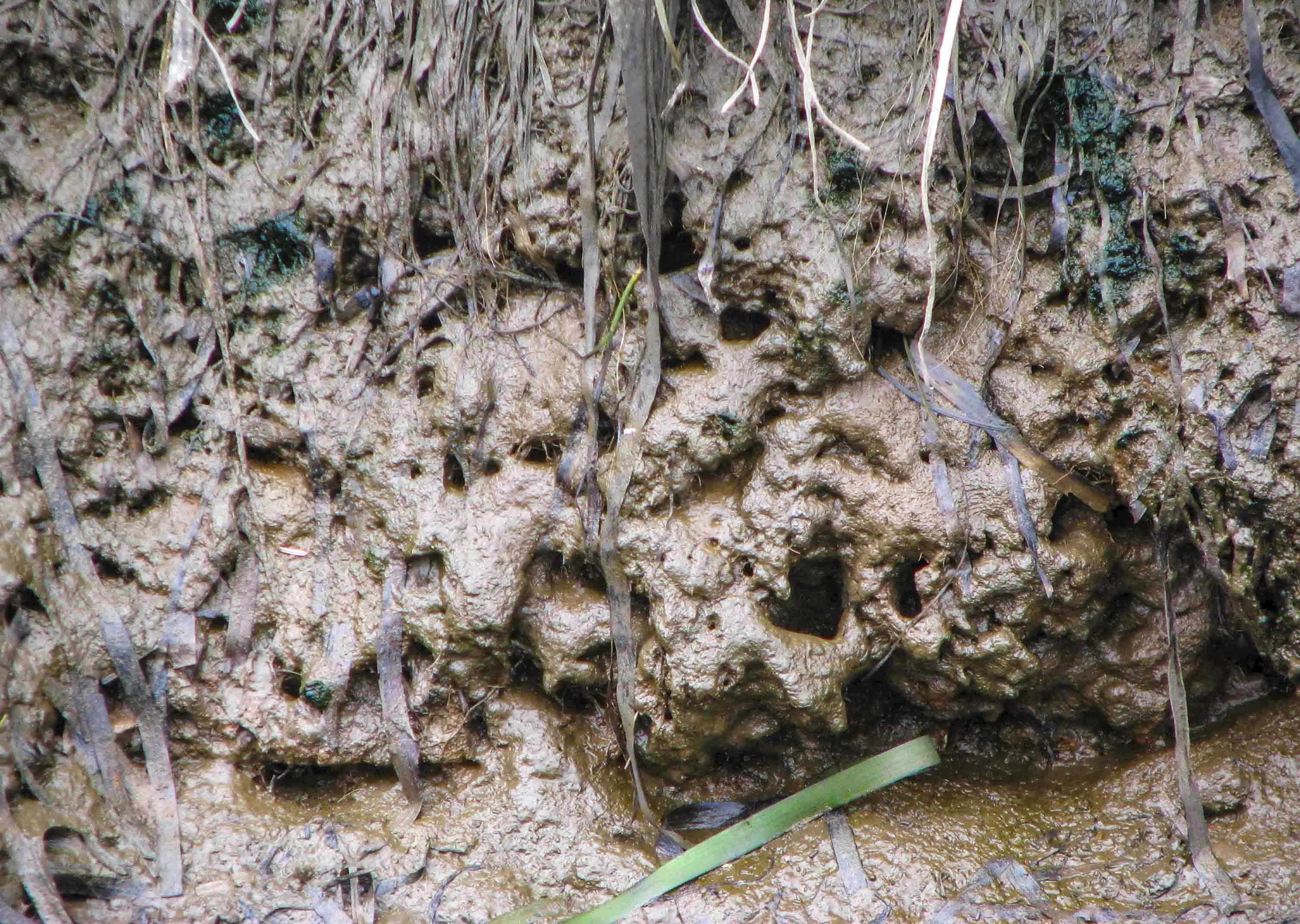 Most channels meander in a sinuous, snake-like pattern. This meandering is the result of ebbs and floods of tidal waters that cause the slumping of channel banks, particularly during at ebb flows which, according to Fagherazzi et. al., 2004, have water velocities stronger that those during flood flows, resulting in differential bank erosion.