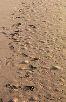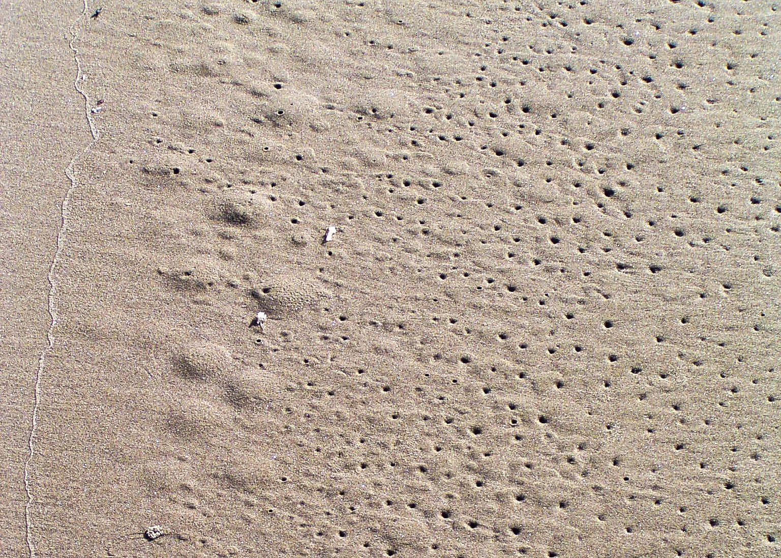 When you walk along the sandy beach and watch the waves flow onto dry sand during an incoming tide, you may notice hundreds of small round holes form as the wave recedes.  Along with the holes, small mounds of sand several centimeters across are left as the wave sides back to the sea.  You might wonder if something is living in all these holes and mounds, and if you are really curious, you may scoop out some of the sand, sift in through a fine-mesh screen to capture any critters, and find --- nothing!