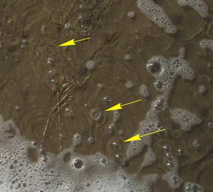 So what is making all these holes and mounds?  It’s air! Dry (or damp) sand has air trapped among the grains.  The grains, though they touch each other, are irregularly shaped.  Where there is no contact, they leave spaces filled with air.  As the water spreads over the sand, it seeps down through the grains, forcing the trapped air to percolate upward.  The air starts out as small bubbles which coalesce as they come in contact with one another, creating larger bubbles as they work their way upward.  These larger bubbles forge a pathway to the sand surface.  If you look closely just behind the leading edge of the wave where the water is only a couple of centimeters deep, you will see bubbles emerging from the holes (center right - arrows).