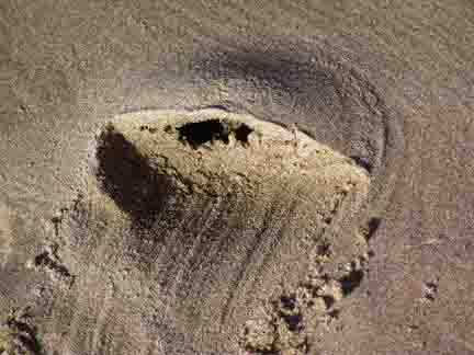 What about the mounds?  They are formed simply by large bubbles of air that have collected under the sand, lifting it but not breaking though the surface.  If you dissect one of these mounds, you will find a lens-shaped air cavity a centimeter or two under the surface that has lifted the sand into the shape of the mound (bottom right).