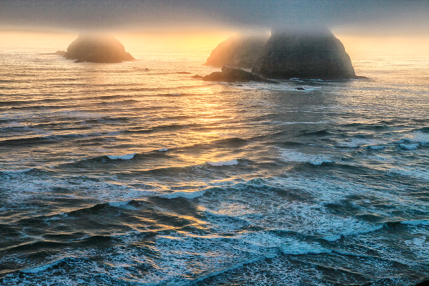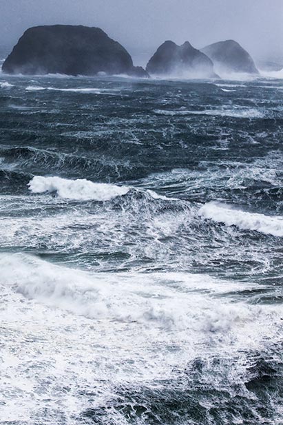 Winter storms on the Oregon Coast draw a special breed of tourist, the Storm Watchers. They come here just to see the drama and violence of hurricane-force winds and some of the world’s wildest surf - massive breakers, Brian Bedford’s White Horses, galloping toward shore, trailing manes of white, wind-blown froth from their heads as they pound beaches and rocks, sending spray high into the air. Sunlightrefracting through their mist gives them the colors of rainbows.
