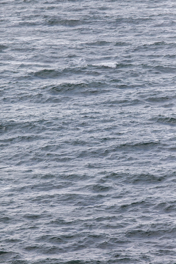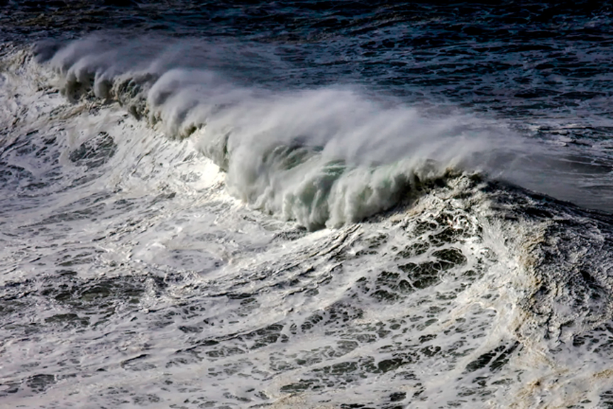 Let’s get back to ocean waves, beginning with those caused by local winds, wherever “local” may be, either here on the coast or far out at sea.  As the wind blows over the ocean, the pressure of the moving air deforms its surface, creating initially ripples (called capillary waves by oceanographers), then as the wind speed increases, larger waves.  Waves also depend on the wind’s fetch, that is, how far it blows, and for how long.  The faster, farther, and longer the wind blows, the bigger the waves.  Waves generated by local winds are chaotic and move in all sorts of directions.  They form what we commonly call chop, and we speak of this roughness as sea.  Marine weather reports might describe the sea as a four-foot sea, a six-foot sea, and so forth.If the waves are steep enough, they break and we get whitecaps.  When the wind blowing at a given speed has a long enough fetch and blows for a long enough time, the sea reaches its maximum roughness, beyond which it cannot get any rougher at that wind speed.  This is called a fully developed sea.  For example, a sea becomes fully developed during a 25 mph wind after it has blown over a distance of 109 miles for 11.5 hours (Thurman 1991).
