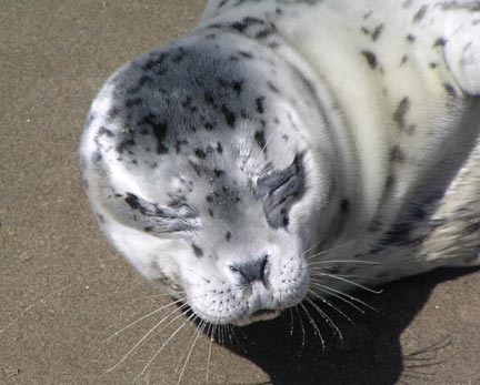 Their color is generally gray-brown with an arrangement of darker spots and rings unique on each individual.  Their pelage, or fur, consists of coarse guard hairs underlain with dense, fine under hairs, which they molt annually.  During the summer you may see some seals with a growth of green alga on their backs.  Insulation is not provided by their coat but by a layer of blubber, which has blood vessels that constrict in cold water to conserve heat and dilate when they haul out to release heat.  Their eyesight is good, especially underwater, but they do not perceive color.  On land, they continually secrete mucous that coats and protects the eyes and drips down the sides of their faces, giving them a rather tearful, sorrowful look.