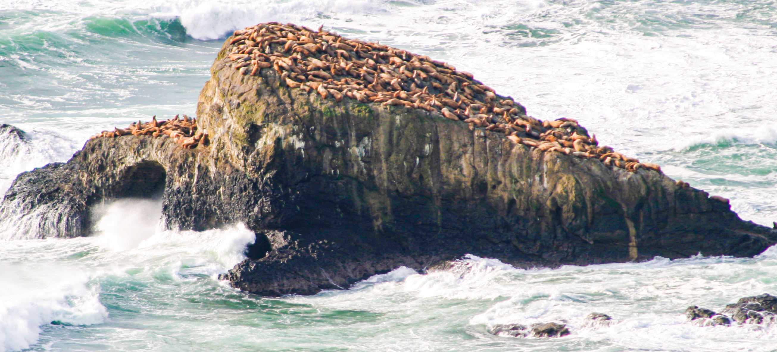 Netarts Bay has it own year-round population of harbor seals, Phoca vitulina richardii, which you can often see at low tide, hauled out on the sand bar opposite the Netarts Bay R/V Park and Marina or just inside the end of Netarts Spit across from Happy Camp.  These two favorite haul-out sites are adjacent to deep water, allowing a ready escape if the seals are disturbed.  On the sand, they may lie prone and relaxed, or they may assume what is called the banana posture where they rest on their bellies with their heads and hind flippers raised in the air, looking much like large, gray bananas.  They tolerate boaters who keep their distance, but if you approach them as they bask on the sand bars, even creeping up on them in a silent kayak, they raise their heads like sentinels and watch your every move, full of caution and curiosity, until at the critical distance, when nervousness evolves into the feeling of threat, they slide into the water where they feel safe.  They will surround your boat, their heads poking out of the water, still reserved but interested, their big brown eyes wide with both wary and wonder.   They are cumbersome on land, wiggling and scooting on their bellies, but in the water they are swift and agile, their torpedo-like bodies capable of underwater acrobatics.  This sub species of harbor seal ranges from Cedros Island, a little more than a third of the way down the Baja California peninsula, to Alaska’s Aleutian and Pribilof Islands.  They are not endangered; their total population surpasses 300,000.  There are over 150 in Netarts Bay, perhaps as many as 200.  They do not migrate but remain mostly in the bay, protected from predators such as killer whales, sharks, and steller sea lions, occasionally venturing into the ocean to roam, but not far from shore.  They are opportunistic feeders, eating fish, crustaceans, including Dungeness crabs, squid, and mollusks.  They generally swallow their food whole.