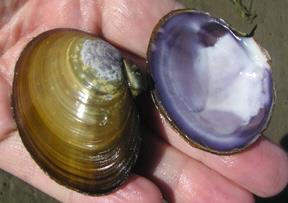 The Pacific Gaper Clam (Tresus nuttallii) is the largest and deepest burrowing clam in the bay. Also called the horse clam, it can reach eight inches long and burrow down to three or more feet. Its shell, when not stained, is creamy white and partly covered with a brown varnish-like chitinoid coating called a periostracum. The two shells gape on the posterior end where the neck protrudes, hence its common name. The clam can also be identified by the internal hinge ligament that fits into a pair of spoon-shaped depressions in the shells called chondrophores. The large neck, the meatiest part of the clam, has fused incurrent and excurent siphons and is sheathed with part of the periostracum. The tip of the neck bears two hard, leathery plates. These gaper clams are found in various parts of the bay, usually clustered in sandy sediments. The neck hole is an inch or more across, and if you stick in your finger, you can feel the hard plates just before the siphons is retracted. You may also get hit with a jet of water that is expelled when the clam is disturbed. When digging for the clam, be careful not to break the fragile shells. The neck, after tenderizing, is good fried or in chowder, but should be dipped in boiling water first to aid in removing the periostracum. The leathery plates can be clipped off. When cleaning the clam, you will likely find one of three species of commensal (or parasitic) pea crabs, Pinnixa faba, Pinnixa littoralis, or Fabia subquadrata in the mantle cavity. They also inhabit other clams.